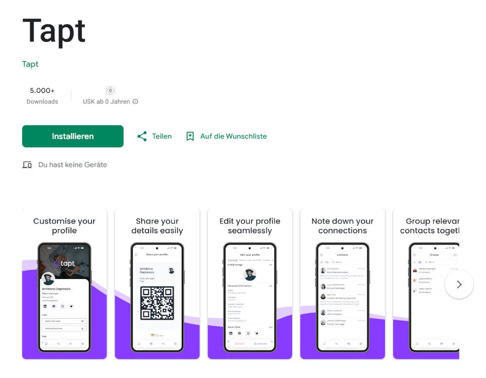 Tapt vereinfacht die Erstellung und Verwaltung digitaler Visitenkarten durch ein benutzerfreundliches Interface und moderne Designs. Die App ermöglicht die schnelle und unkomplizierte Weitergabe von Kontakten über QR-Codes und NFC-Tags. Tapt bietet zusätzliche Funktionen wie personalisierbare Vorlagen, Integration mit Social-Media-Kanälen und Analytik-Tools. Die Basisversion ist kostenlos, während Premium-Accounts ab 3 $/Monat verfügbar sind und erweiterte Anpassungs- sowie Team-Optionen bieten. Unternehmen können zudem individuelle Business-Pakete buchen.