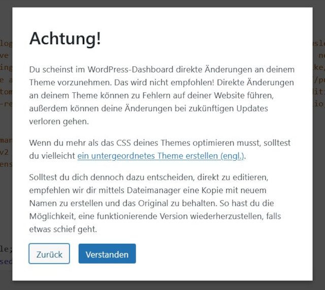 Du scheinst im WordPress-Dashboard direkte Änderungen an deinem Theme vorzunehmen. Das wird nicht empfohlen! Direkte Änderungen an deinem Theme können zu Fehlern auf deiner Website führen, außerdem können deine Änderungen bei zukünftigen Updates verloren gehen.“