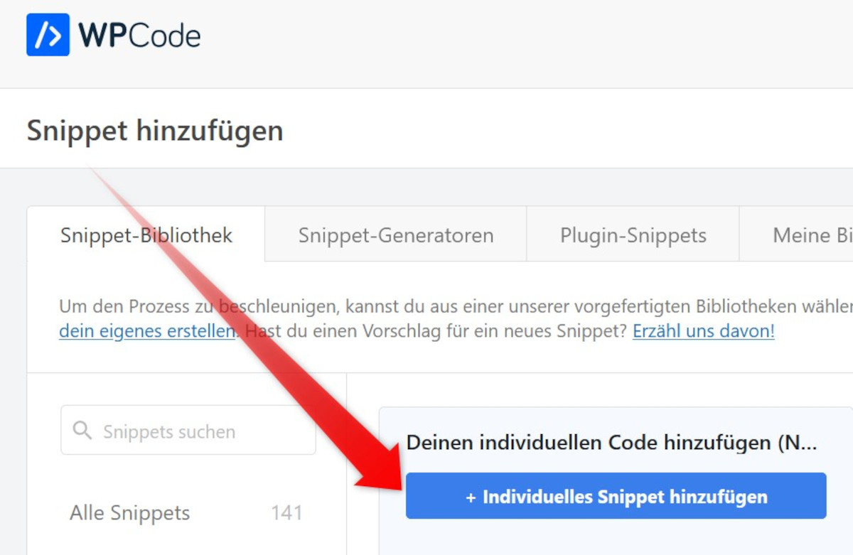 Sie arbeiten gerne entspannt? Dann sollten Sie Code-Anpassungen besser über ein Plugin vornehmen. Ein bewährtes Plugin nennt sich WPCode. Die kostenlose Version können Sie direkt über das Backend von WordPress installieren. Nach der Installation und Aktivierung des Plugins klicken Sie dann auf Snippet hinzufügen und anschließend auf Individuelles Snippet hinzufügen.