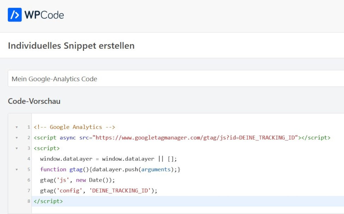 Im nächsten Fenster können Sie dann den Code einfügen, den Sie erhalten haben. Beispiel für einen Tracking-Code von Google Analytics: