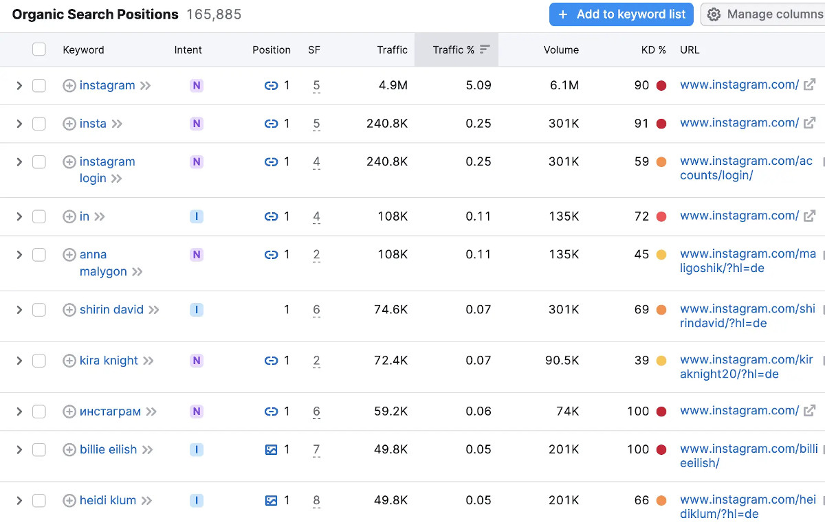Die trafficstärksten Position 1 Rankings von Instagram sind neben der eigenen Marke Profile von Prominenten und Influencern. (Quelle: Semrush.com)