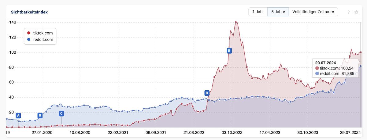 In Deutschland hat tiktok.com mittlerweile reddit.com in der Sichtbarkeit überholt. (Quelle: sistrix.de)