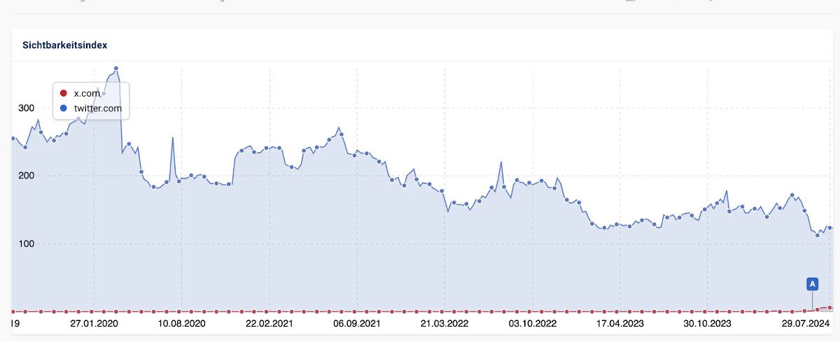 Ein Blick auf die Sichtbarkeitskurven von x.com und twitter.com zeigt das klassische Bild eines massiv verhagelten Relaunches:
