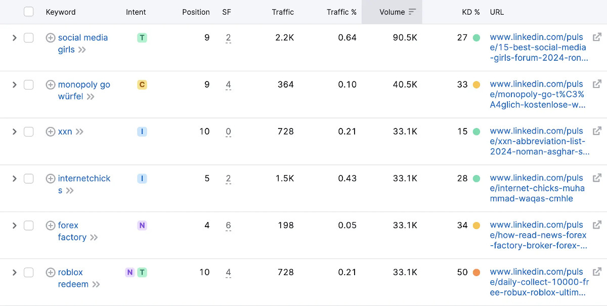 Ein Blick in die Top 10 Rankings der Pulse-Beiträge auf LinkedIn offenbart allerdings ein Sammelsurium an Spammern, KI-generierten Inhalten, Affiliates und Playern in extrem umkämpften Märkten (die 3 großen P: Porn, Pills & Poker), die sich alle den Vertrauensvorschub von LinkedIn bei Google zunutze machen. Ob nun allerdings das Ranking für „XXN“ mittels eines Artikels zu Abkürzungen wirklich effektiv ist (der Verfasser ist – wenig überraschend – im Bereich SEO tätig), obwohl er zu 100% am Userintent vorbeischrammt, sei dahingestellt.