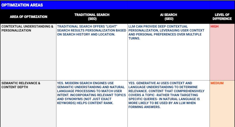 GEO ersetzt SEO nicht, sondern verschärft dessen Anforderungen. Technische Exzellenz, inhaltliche Qualität und Markenautorität sind nicht länger nice-to-have, sondern Mindestvoraussetzung, um auch im Zeitalter der generativen Suche sichtbar zu bleiben. Eine großartige Zusammenfassung der Veränderungen im SEO vs. GEO findet sich im Google Sheet von Aleyda Solis: