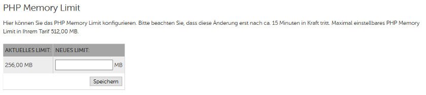 Sie finden diese Funktion unter: Produktverwaltung -> Skripte&Datenbanken -> Skript-Einstellungen -> PHP Memory Limit