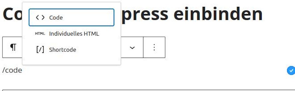 Die zweite Möglichkeit ist, „/code“ in das Feld zu schreiben und so den Codeblock auszuwählen.