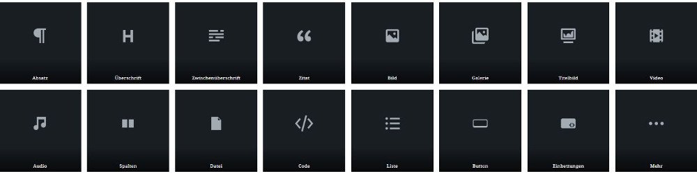 - Blöcke für Medienelemente wie Bilder, Videos, Galerien,