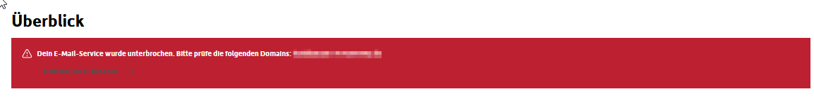 - Sie haben die Schritte 1-3 ausgeführt und möchten nun den Microsoft Konflikt finalisieren und die Domain wieder zuweisen. Dies können Sie in der E-Mail-Administration vornehmen, die Sie im KIS über "Produktverwaltung - Email - Jetzt starten" erreichen. Sie sehen dann oben eine rote Fehlermeldung. Klicken Sie hier auf "Hilf mir, das zu beheben".