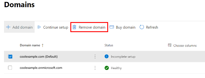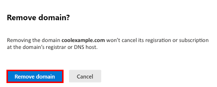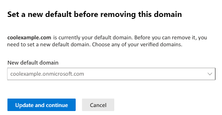 - If the domain is set as the default for your account, you will be prompted to set a new default. Select a new domain, then select Update and continue.
