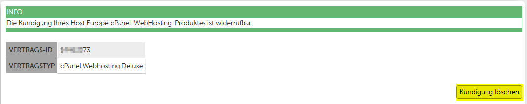 Wenn Sie eine vormals ausgesprochen und bereits bestätigte Kündigung widerrufen möchten, kontaktieren Sie uns bitte über vertrag@hosteurope.de oder über eine KIS-Supportanfrage, die Sie über den Menüpunkt Support einreichen können.