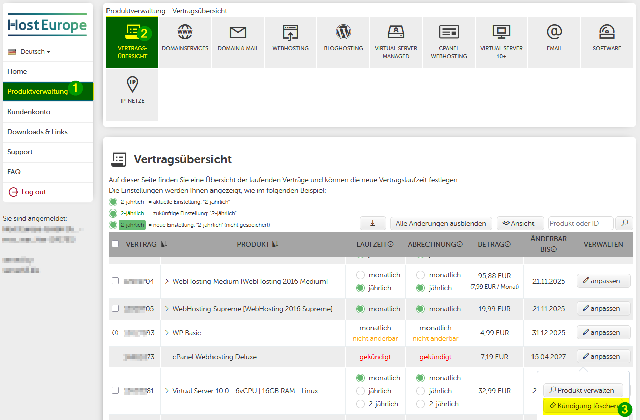 In diesem Artikel wird beschrieben, wie Sie eine bereits eingetragene Kündigung Ihres Produktes wieder löschen können, so dass Ihr Produkt unverändert weiter läuft. Bitte beachten Sie, dass es bei manchen Produkten zu Abweichungen kommt. Darauf weisen wir an entsprechender Stelle hin.