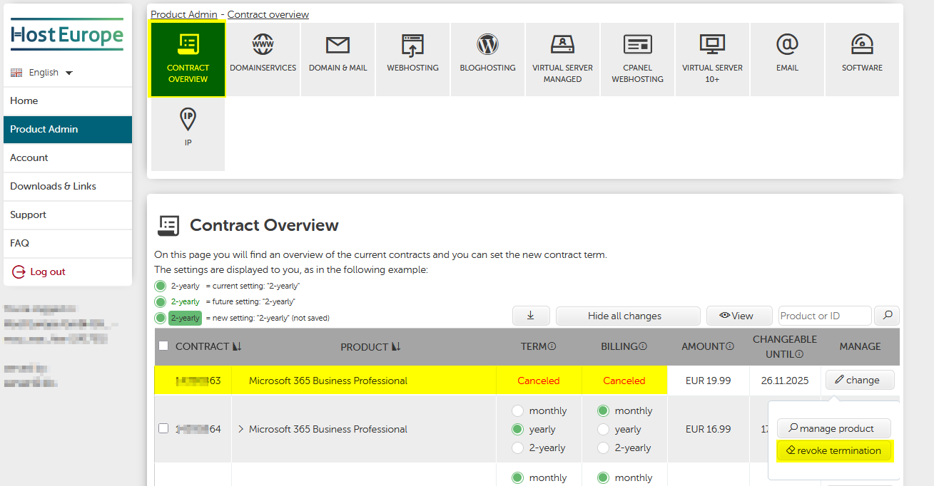 Now select the cancelled product via the "change" button and then "revoke termination".